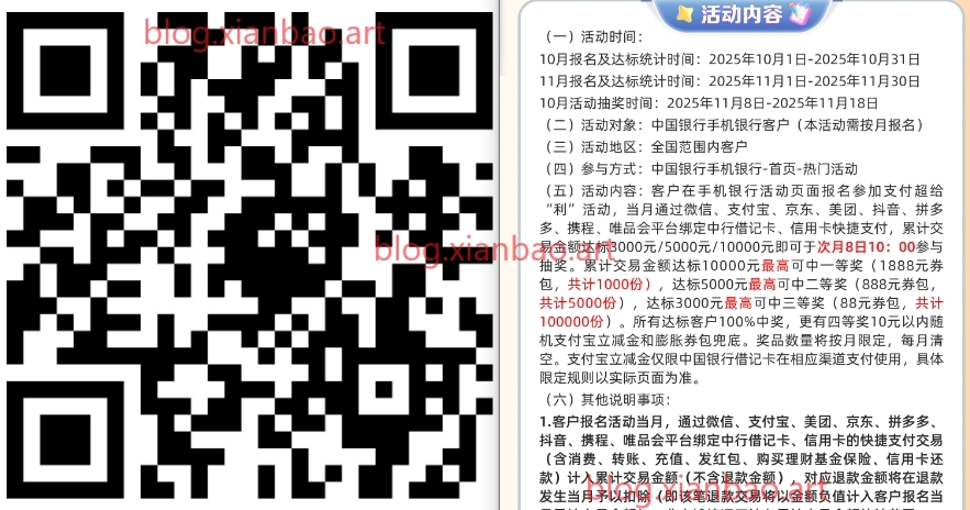12月达标用户今天10点可抽 !1月新一期!中行app搜:支付超给利,先报名参加,达标后次月8号手动抽立减金,可以叠加文末的活动参加。上个月中的多次领取记得去权益礼包点进去领次月的,部分次月的是不自动发放的