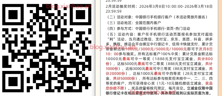 1月达标用户今天10点可抽 !2月新一期!中行app搜:支付超给利,先报名参加,达标后次月8号手动抽立减金,可以叠加文末的活动参加。上个月中的多次领取记得去权益礼包点进去领次月的,部分次月的是不自动发放的