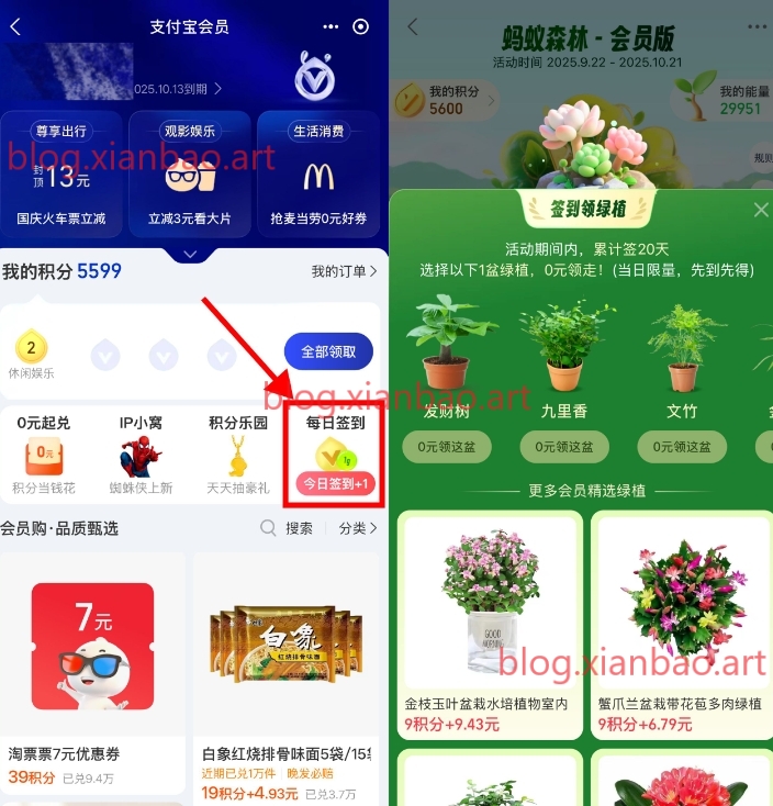 支付宝搜索“支付宝会员”,右侧“每日签到”,累计签到20天0亓领绿植包邮