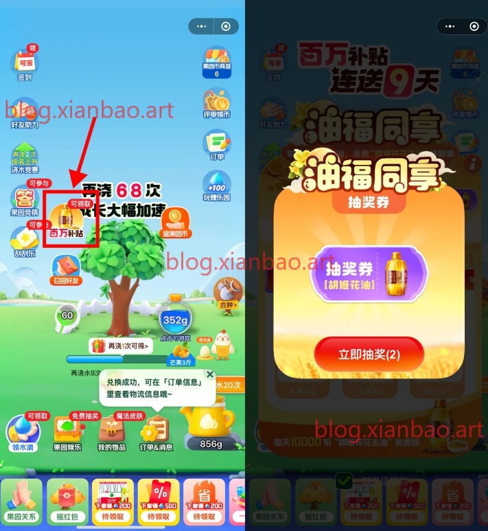 美团APP搜索“小美果园”,百万补贴,每天完成所有浏览得次数,每天抽1万份胡姬花花生油,每天0点刷新库存