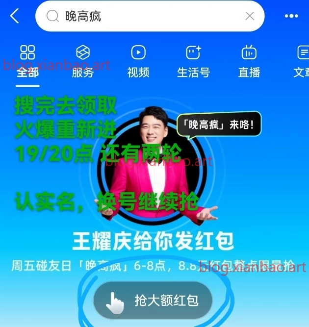 支付宝搜:晚高疯,准点进,如不弹反复尝试,一般持续2-5分钟,在之后还不弹的基本没有
