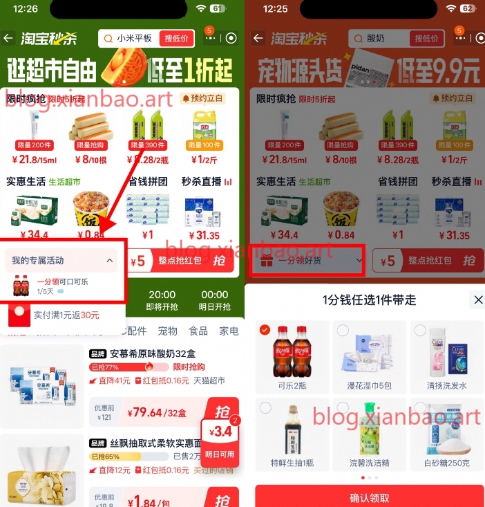 淘宝首页“淘宝秒杀”,一分钱好货,任选一件实物,签到5天0.01亓包邮到手