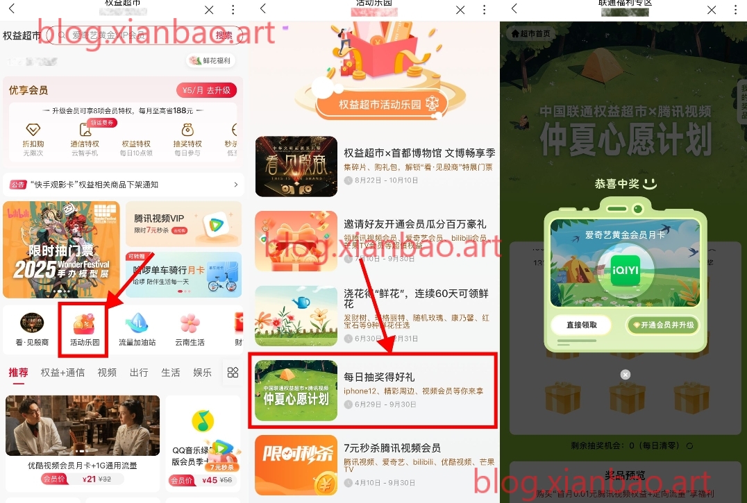 联通APP搜索“权益超市”,活动乐园,仲夏心愿计划,简单浏览得次数,抽爱奇艺或腾讯视频会员等