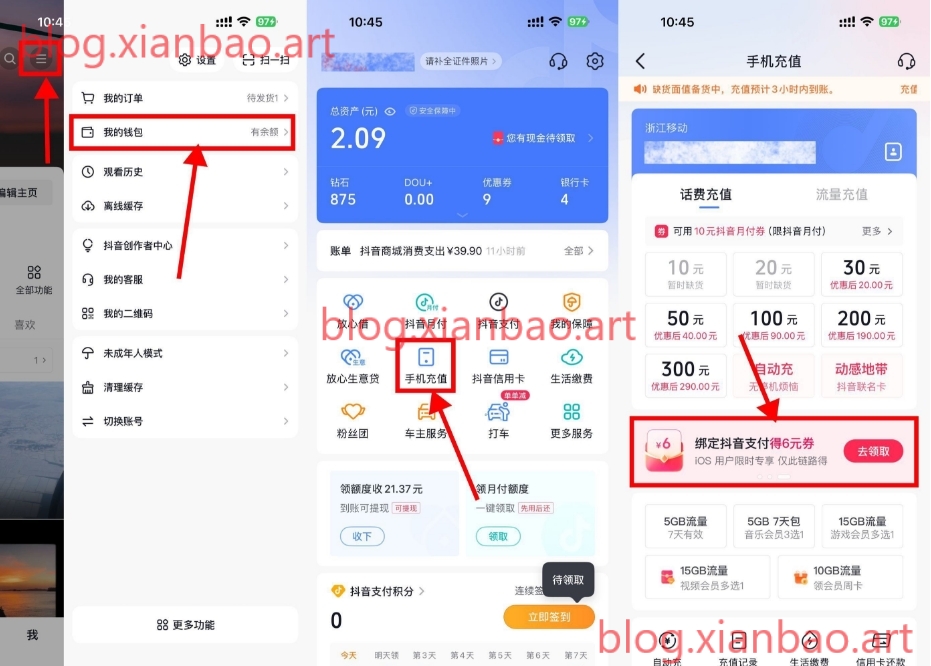 抖音APP底部“我的”->右上角点开“我的钱包”->手机充値->苹果用户可领6亓支付券,这个券可以在别的APP用苹果支付即可自动抵扣,比如QQ音乐绿钻、游戏充6亓等