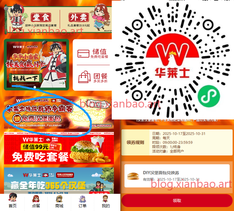 微xin识别,华莱士领汉堡面包,10.17-30日150w份先到先得,可领兔费汉堡面包券,首页下拉 或点餐页横幅领