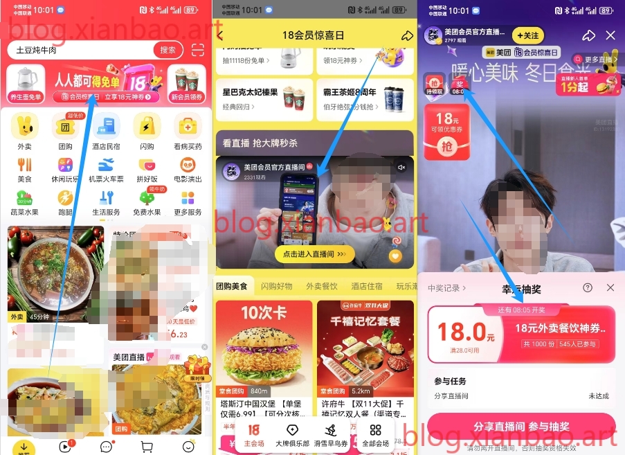 美团app首页顶部横幅,下拉找到直播间,悬浮图标全天抽18无门槛外卖,每15分钟抽18(有时候会变20-18),左上角福袋抽(不显示是正在抽,等几分钟即可),假分享接即可
