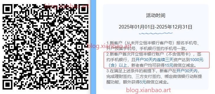 恒丰银行新用户报名后,首次开立恒丰银行账户,不需要定位,并签约并且在30天内,连续三天资产达到1000亓以上,放电子卡内余额就可以,可得15亓微xin立减金,完成签约额外5亓,绑定抖音/京东/拼多多还有立减5优惠,扫码报名: