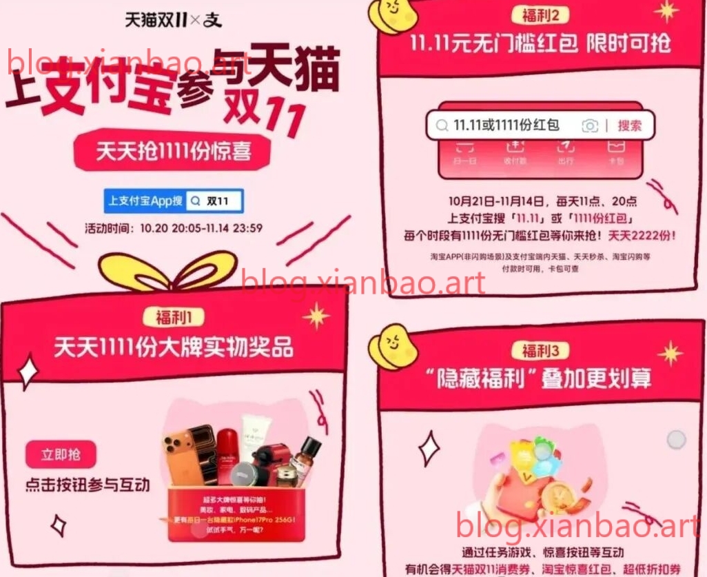 10.21-11.14每天11/20点,支付宝搜:11.11,整点可抢11.11无门槛红包,各有1111份鸿包每天共2222份,淘宝APP(非闪购场景)及支付宝端内天猫、天天秒杀、淘宝闪购等付款时可用,卡包可查