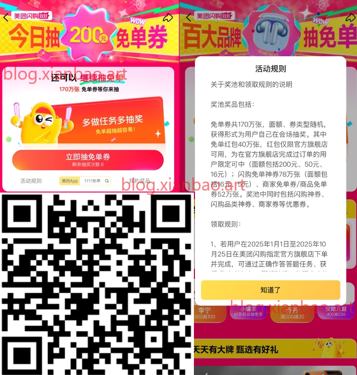 美团APP扫码或搜索:1111免单,每天浏览得次数,抽16~200亓商品免单或16亓闪购免单