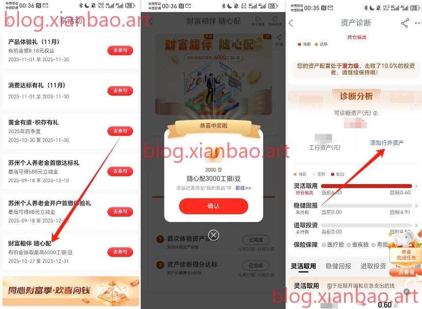 工行APP ,“任务中心”,享活动-如图四个财富相伴 随心配,试试抽3000工银i豆,第一个需要首次,第二个添加外行,每个填2w看表低的再对应项增加。可以换立减金,我的-工银i豆可以兑东西,或者攒着以后再换微xin识别,1100豆就可以换1立减金:mp://kVwTqfYuaJ4Ekap