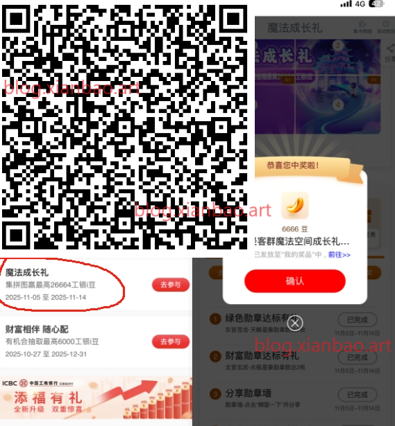 工行app搜:工行消费季,一次机会抽i豆。工行APP ,“任务中心”,享活动-如图魔法成长礼(下图旧图活动为今天新一期路径一致),部分没有活动。可以换立减金,我的-工银i豆可以兑东西,或者攒着以后再换微xin识别,1100豆就可以换1立减金:mp://kVwTqfYuaJ4Ekap