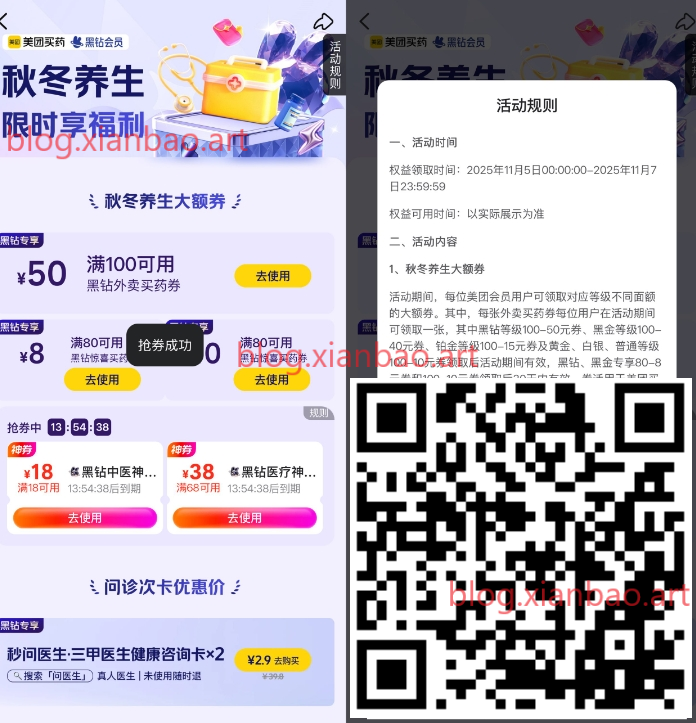 美团APP扫码,黑金领100-40亓券,黑钻领100-50亓券,换季囤药刚好用的上