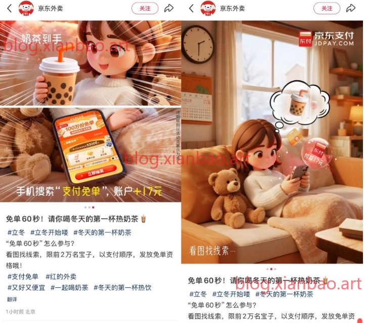 14点30京东外卖2W免单奶茶,前60秒按支支付顺序算,应该不算难,有需求的留意,路径:搜支付免单,选择刚才下的外卖订单,可100%中免单,封顶50),免单资格的发放存在延时,请在收到外卖后再去活动页抽免单,或支付后等待40分钟再去抽。若用户在获得免单资格后,但在抽免单时未选择外卖订单,而是选择了其他订单,则外卖免单资格失效,免单资格自动转移到用户选择的其他订单上。