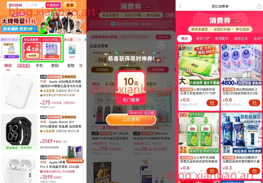 10点去试试!拼多多APP首页“百亿补贴”->百亿消费券->抽10亓无门槛券,有很多几毛包邮的大牌实物