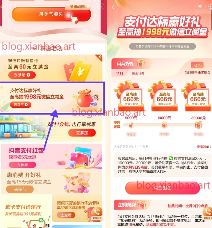 上月达标本月可抽,下月可继续参加。建行APP搜索“惠省钱”->下拉点横幅进入->先去报名一下->累计消费满5k/1w/3w亓各得1次机会,抽最高1998亓立减金