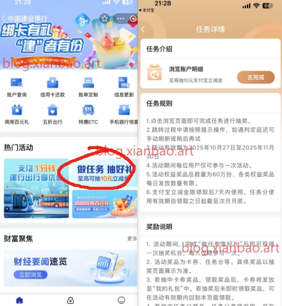 支付宝APP搜中国建设银行-服务-做任务抽好礼-跳转建行APP-浏览后抽奖
