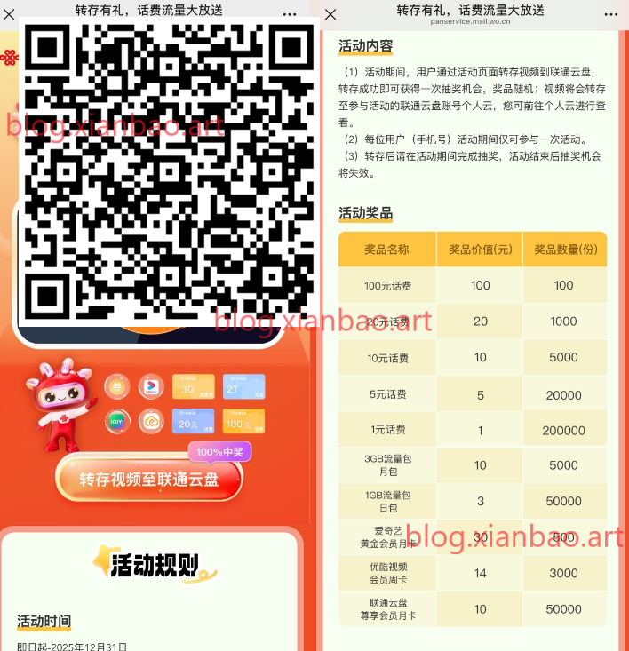 三网用户均可参与,直接转存抽1~100亓话费或视频会员等