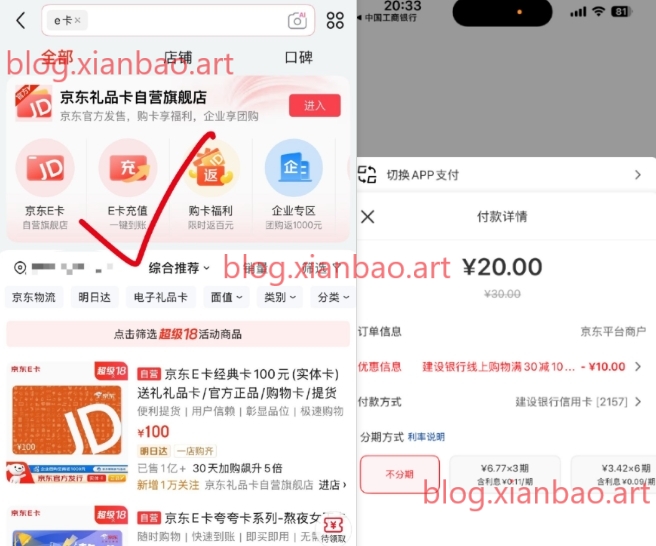 京东搜e卡,需要卡密的看步骤二买这个忽略,如如图选e卡充30,付款选芸闪付,再切换建行App有30-10,不是建行生活 ,如果提示未安装APP或版本过低,先确认是不是最新版,如果是最新版,还不行就清除数据,然后再跳转