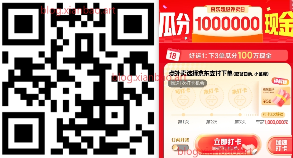 点加速打卡,部分号任务简单不用点外卖就可以打卡,瓜分百万+抽一万张50亓饭卡。需使用京东/白条购买的外卖订单,订单完成可打卡,1笔对应可打卡1次,累计打卡满3次,即可参与瓜分,今天20-23:59淮时瓜分,错过时间默认放弃
