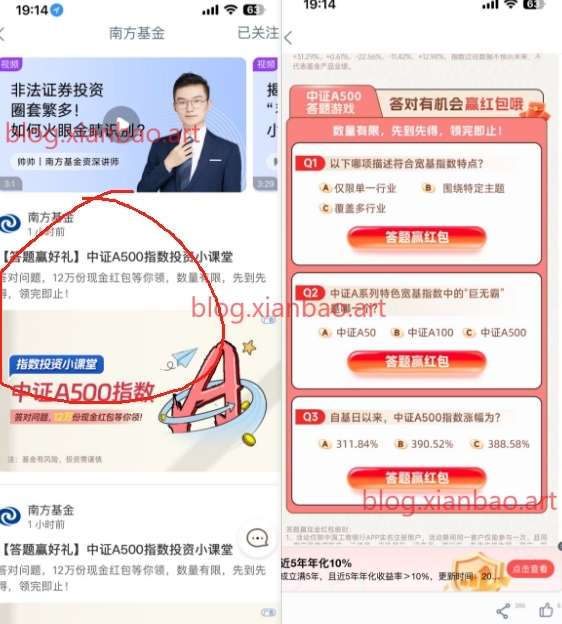 工行APP搜南方基金,下滑找到场景号进去,下滑找到最新的【答题赢好礼】,下滑答题,答案CCC,3个五毛,一共1.5