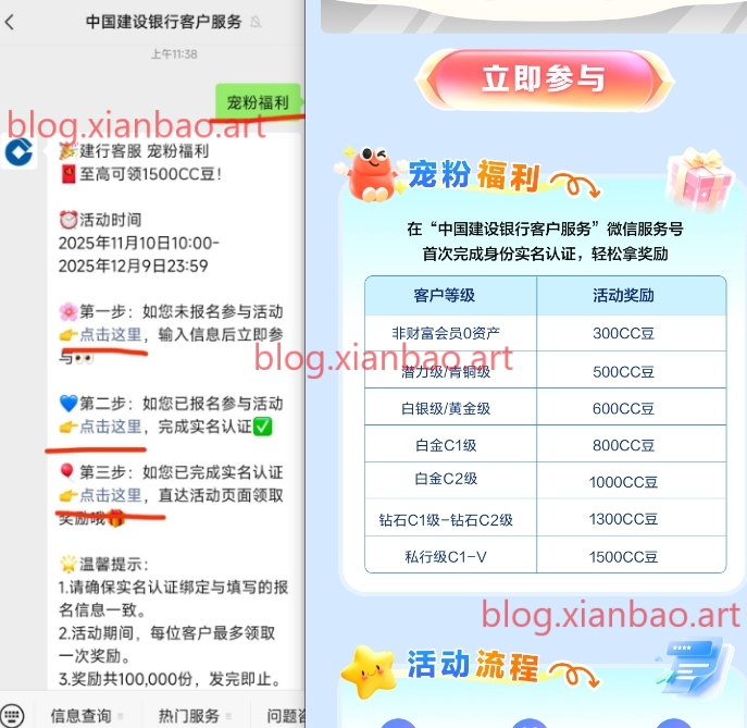 微xin公众号:中国建设银行客户服务,回复宠粉福利,部分人有500CC豆