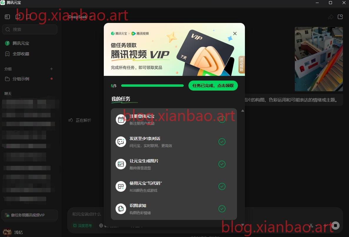 电脑下载“腾讯元宝”客户端,左下角点开挨个去完成,即可领7天腾讯视频会员
