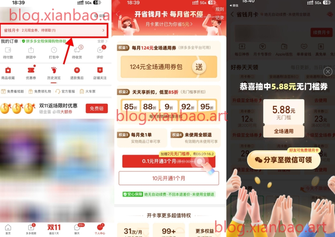 拼多多APP底部“我的”->省钱月卡->目前大部分可0.1亓开3个月,开完重新进入自动弹出 目前大概率5.88亓无门槛神券或0.01亓实物