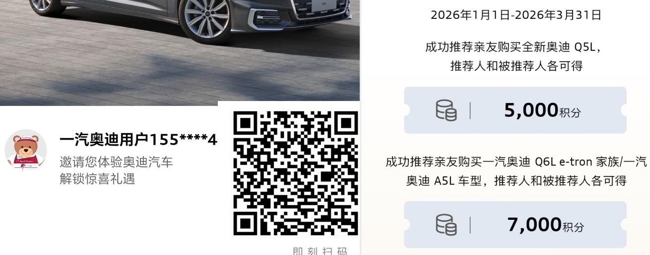 一汽奥迪老带新活动,7000积分活动,被推荐的亲友购车成功,额外拿2000 积分!新车专享,即日起-2026.3.31,推荐亲友买Q5L/Q6L e – tron 家族/A5L,被推荐人,每人再额外得5000 积分,一共能拿2000(被推荐)+5000(新车专享)=7000积分,换几次保养足够!