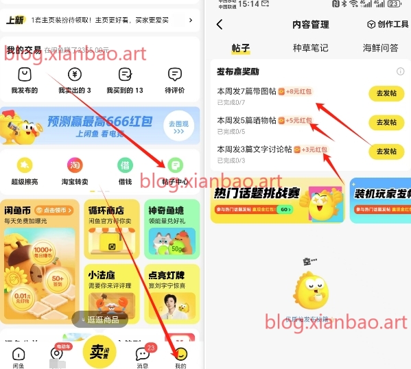 闲鱼app-我的-帖子中心,如图写笔记有咸鱼荭包,最好不乱写