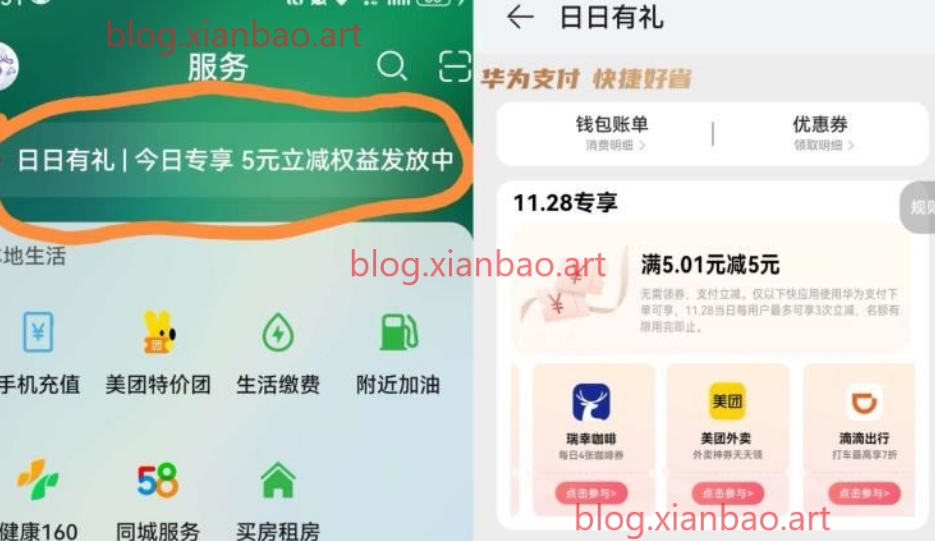华为/旧荣耀,负一屏有-5立减,一号三单,可以点外卖
