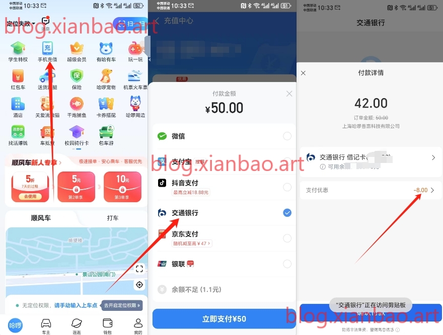 哈罗app-首页手机充值,充50话费,跳转交行-8,部分有抖音-10,需最新版app,付前优惠