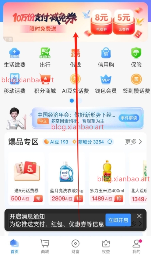 和包app,首页横幅10w份支付减免,点进去开奖。有随机立减金,找不到看这个路径:我的-畅享权益,横幅10w份支付减免