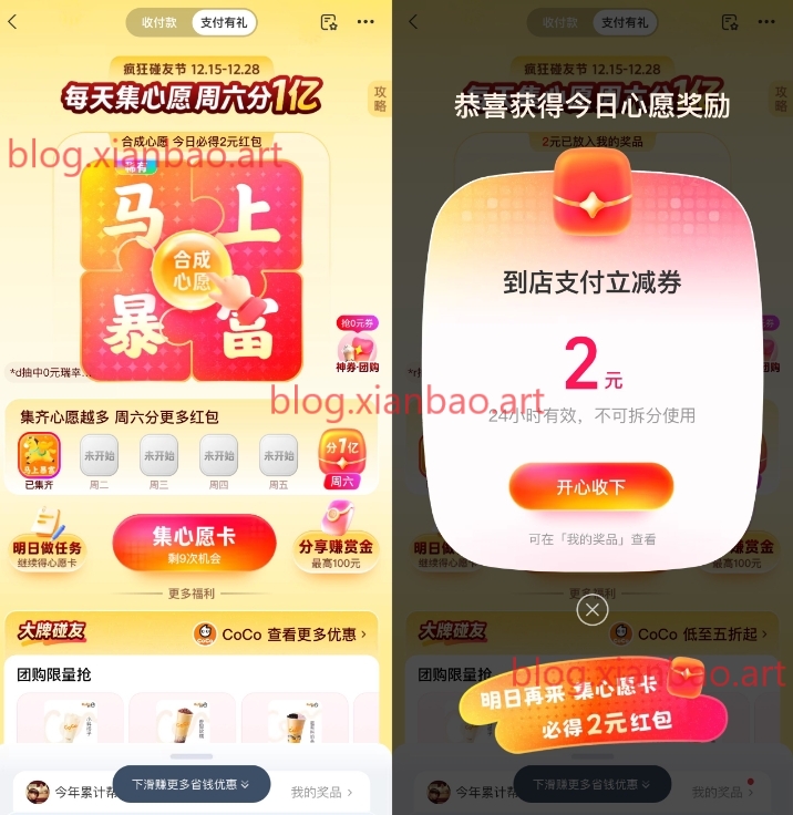 每天一次,继续玩。支付宝搜索“支付有礼”,每天集齐卡片必得2亓到店立减金,周六还可瓜分1亿