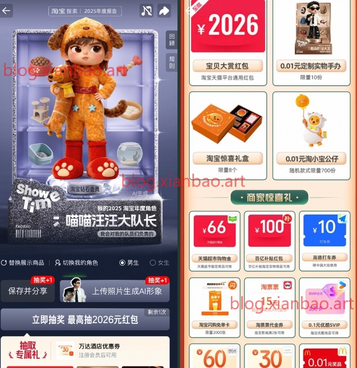 淘宝app搜索“2025年度报告”,划到最后一页有3次机会,抽闪购免单或0.01亓实物等