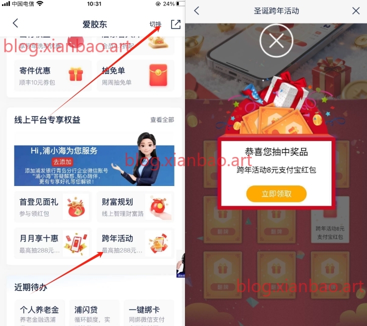 浦发app搜城市服务,右上角改青岛,往下滑抽奖,不限卡,限量