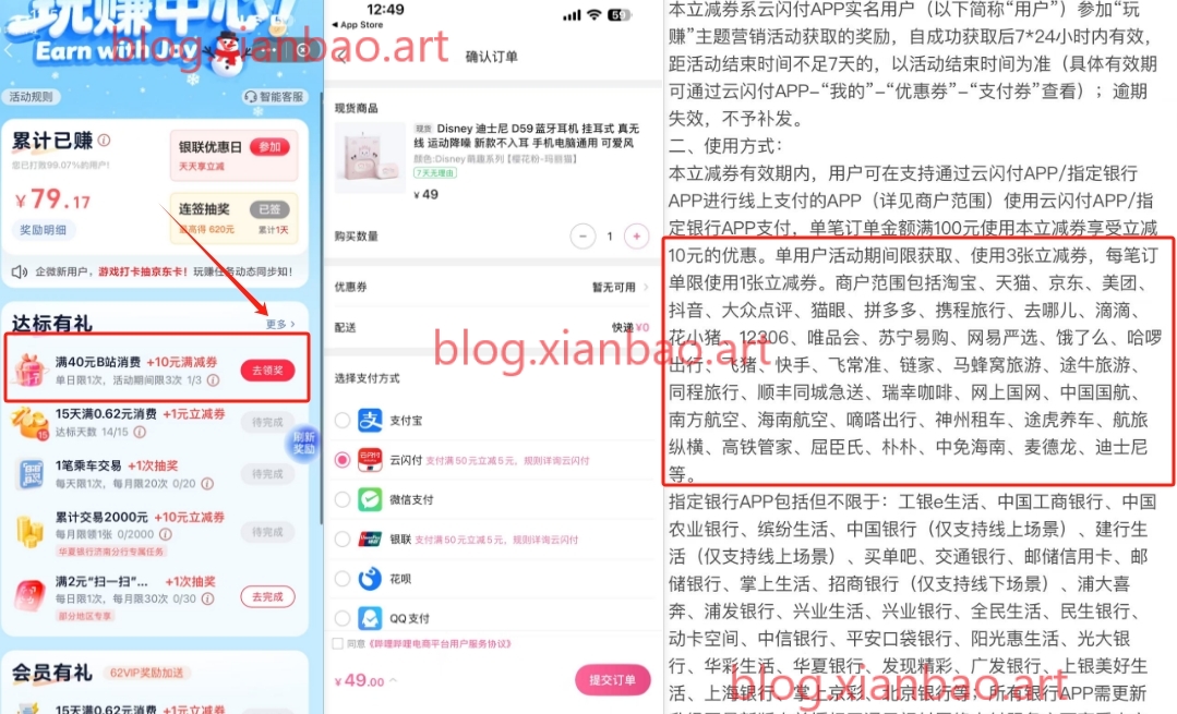 芸闪付app搜玩赚中心,找到达标有礼100-10券,券基本涵盖所有线上商户(水电/外卖/购物等等),达成:哔哩哔哩APP-底部会员购,买大于40块的东西(别选带定金的,不给退),唤醒芸支付,领券后回哔哩哔哩退订单。