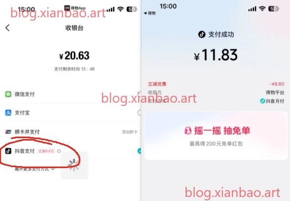 得物app,搜话费找到10或20有货的,然后随意锁单(唤醒付再返回),去我的订单里再重新支付,会显示8.8的抖音支付优惠,有些号可能没抖音支付,实在没有就换个得物号试试,第一次支付进抖音的时候,点下返回键优惠更大,一共有两次,第一次减8.8-9.9块左右,第二次6.8,一个得物号大概率能买5次,第六次就会被检测,一个抖音2优惠2次,dy号的多号多申请