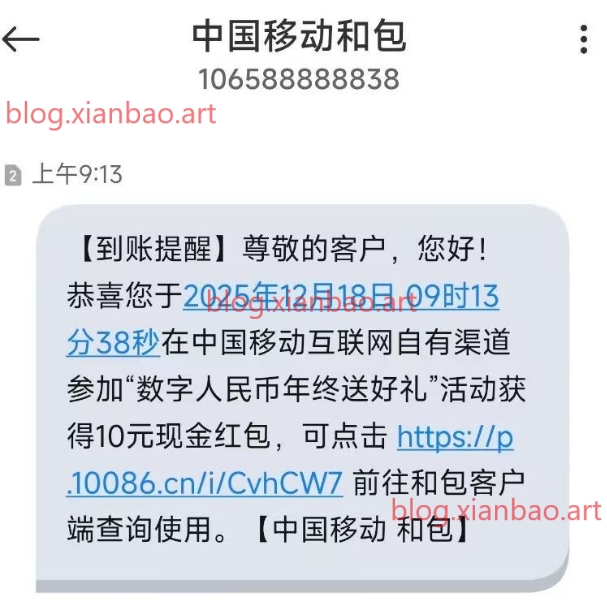 移动使用数币冲1亓话费抽10亓零钱
