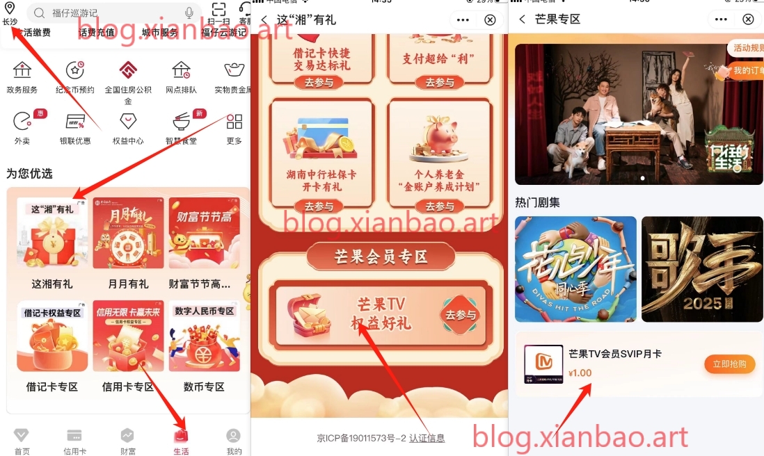 中行app-底部生活-左上改长沙,这厢有礼-最下方芒果绘员专区,有1买芒果会员月卡 ,有渠道的可以代充