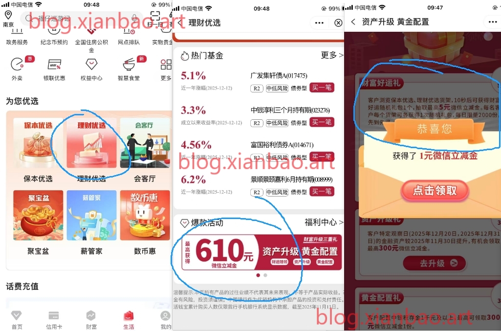 中行app,生活-理财优选,最下面爆款活动,浏览2个最高5亓微xin立减金