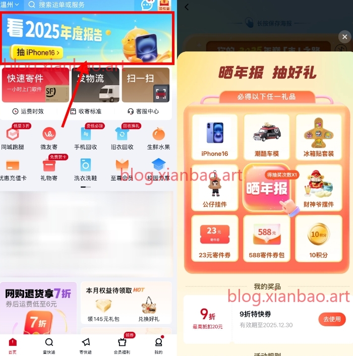 顺丰APP或小程序,首页“年度报告”,划到最后抽实物或寄件免单券,mp://pWieRl9OKr3uhDa