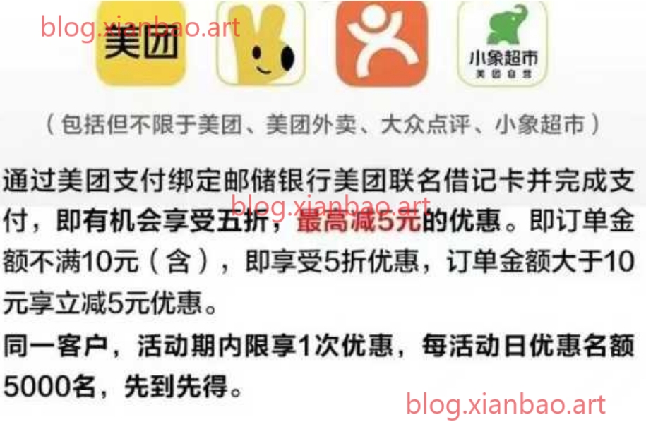 12.24-2026.1.10号每天8点开始,邮储美团卡用户在美团、美团外卖等下单可享受5折最高减5,直接搜生活缴费,冲水电、燃气。美团首页美食专区,可享受5折最高减10,可直接买团购,各限1次,今天没名额就次日再试