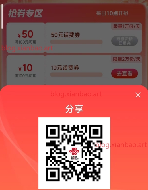 app搜索年终大回馈或识别跳转联通app,12.25-12.31,每天10点可抢100-50/100-10/20-2话费券