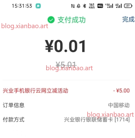 移动app充话费自定义5.01(部分地区最低10),跳转芸闪付切兴业银行app,用兴业卡有-5