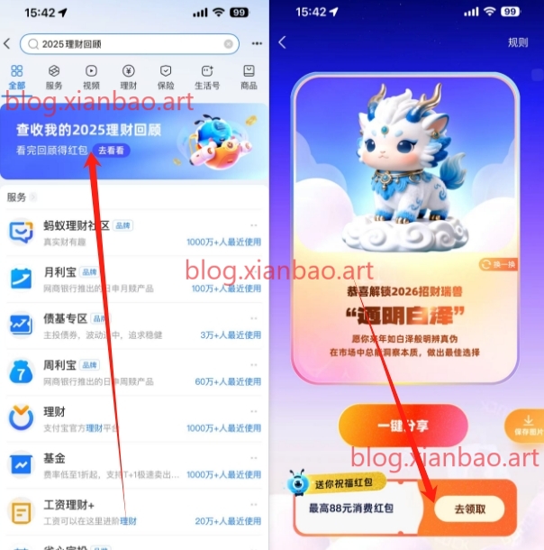 zfb搜【2025理财回顾】,横幅进,抽最高88消费荭包