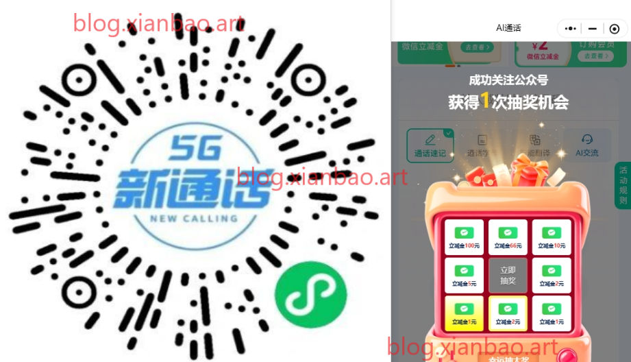 微xin识别,新增关注公众号抽1~100亓立减金,移动用户随便打个AI通话,即可领2亓立减金