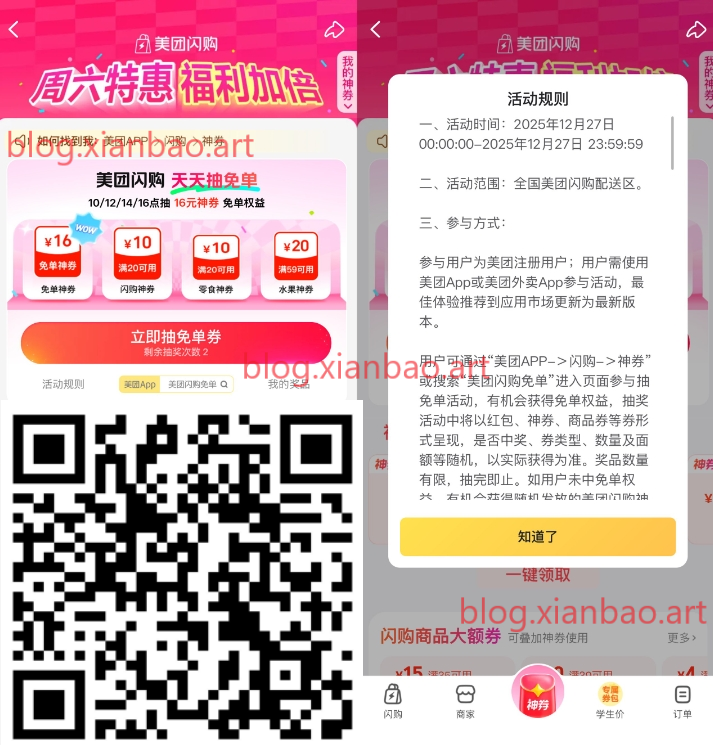 美团APP扫码,卡整点:10/11/12/14/16/17/18点会放水,抽啤酒/水果/闪购免单神券
