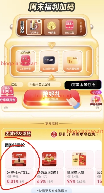 支付宝搜支付有礼,如图部分有0.01亓塔斯汀可乐或蜜雪饮品