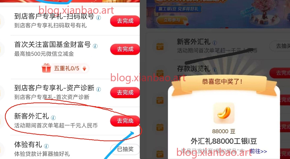 工行app,任务中心-体验有礼(2000豆),如有新客外汇,去购汇再赎回1000以上,有损耗2-3块左右,大部分5000/10000豆小部分运气8.8w豆