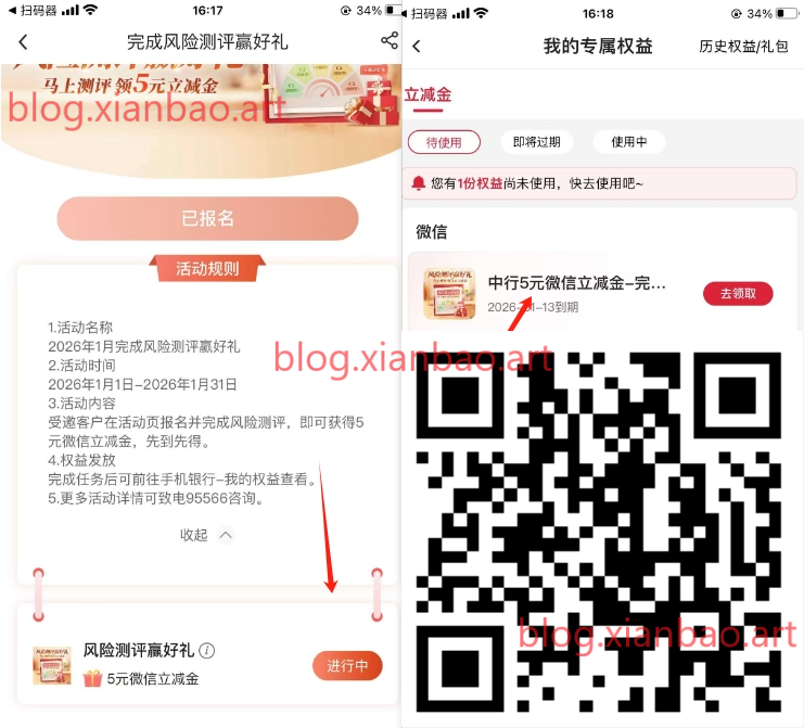 微xin识别跳转中行app,先报名,简单测评一下,完成去app-我的-权益中心找立减金